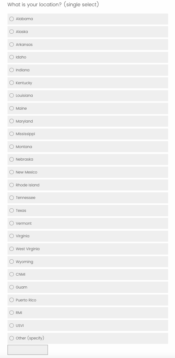 Public reporting burden of this collection of information is estimated to average 5 minutes per response, including the time for reviewing instructions, searching existing data sources, gathering and maintaining the data needed, and completing and reviewing the collection of information. An agency may not conduct or sponsor, and a person is not required to respond to a collection of information unless it displays a currently valid OMB Control Number. Send comments regarding this burden estimate or any other aspect of this collection of information, including suggestions for reducing this burden to CDC/ATSDR Reports Clearance Officer, 1600 Clifton Road NE, MS H21-8, Atlanta, Georgia 30333; ATTN: PRA 0920-1050