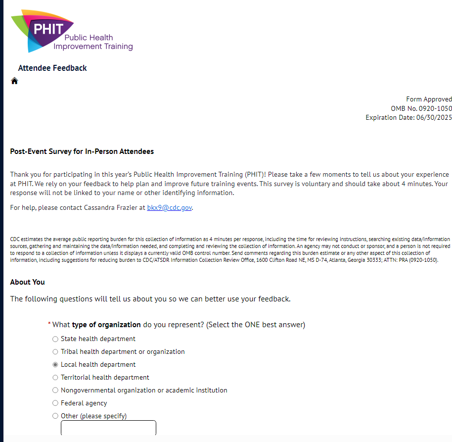 Thank you for participating in this year’s Public Health Improvement Training (PHIT)! Please take a few moments to tell us about your experience at PHIT. We rely on your feedback to help plan and improve future training events. This survey is voluntary and should take about 4 minutes. Your response will not be linked to your name or other identifying information.