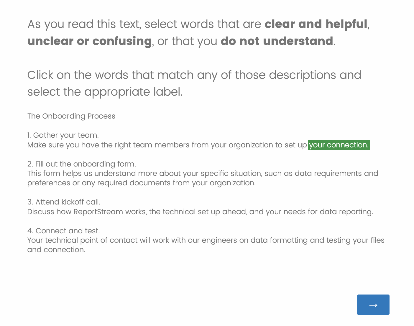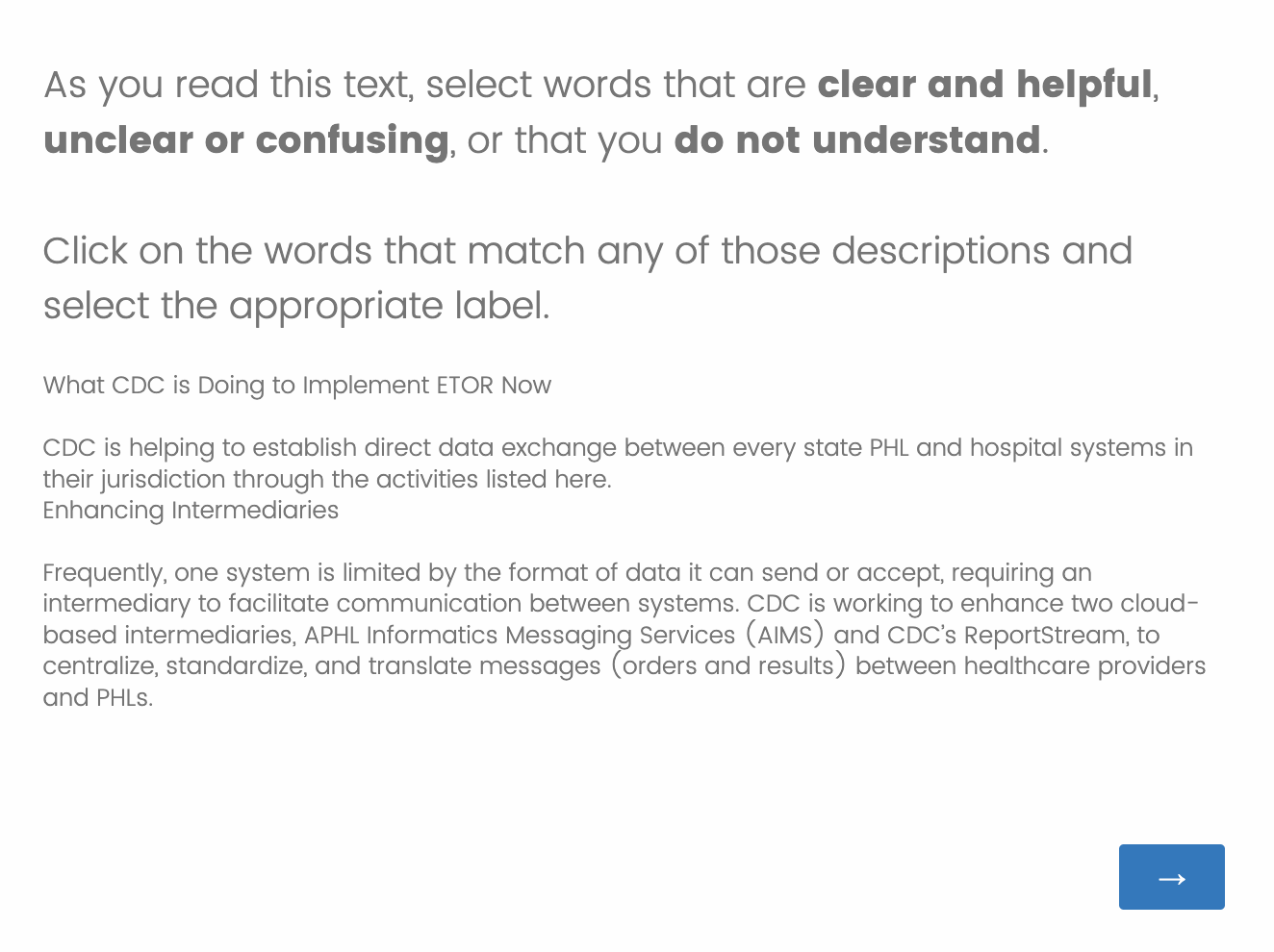 The survey involves looking at 4 different passages of text and answering questions about what you understand or do not understand. It is not a test with right or wrong answers. We want to learn what makes sense to you.