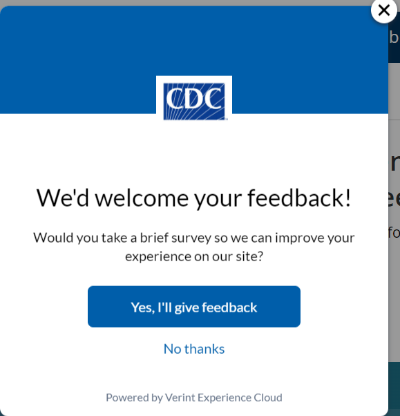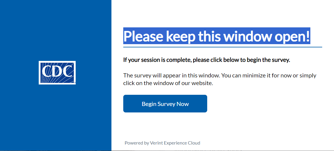 Instructions similar to the following will be shown in the popup survey on the participant’s computer/device screen. The survey is presented to randomly selected visitors to CDC.gov: