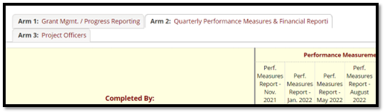 Access the forms From the Record Status Dashboard in REDCap, the Quarterly Workplan Progress Reports (at the top of your workplan forms) and the Funding Allocation Table are in Arm 1: Grant Mgmt. / Progress Reporting (first tab); and the Quarterly Performance Measure Report and Quarterly Financial Report forms are found on Arm 2: Qtr. Performance Measures & Financials Report (second tab).