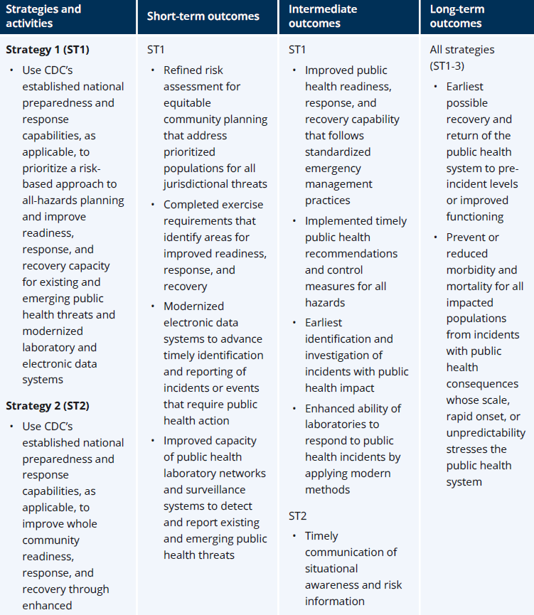 This section details the specific activities PHEP recipients must complete during the five-year performance period, July 1, 2024–June 30, 2029. Performance measures are based on specific short-, intermediate-, and long-term outcomes in alignment with the PHEP logic model (see Appendix A). Recipients must apply the foundational capabilities that the PHEP program has established and track and report progress on 10 cross-cutting priorities anchored in CDC’s RRF. Additionally, Section 319C-1(g) of the Public Health Service Act requires recipients meet benchmark requirements and report complete and accurate performance data. Activities with benchmarks are indicated in Tables 1–10. The guidance delineates linkage of related activities by indicating where credit of related activities is associated.