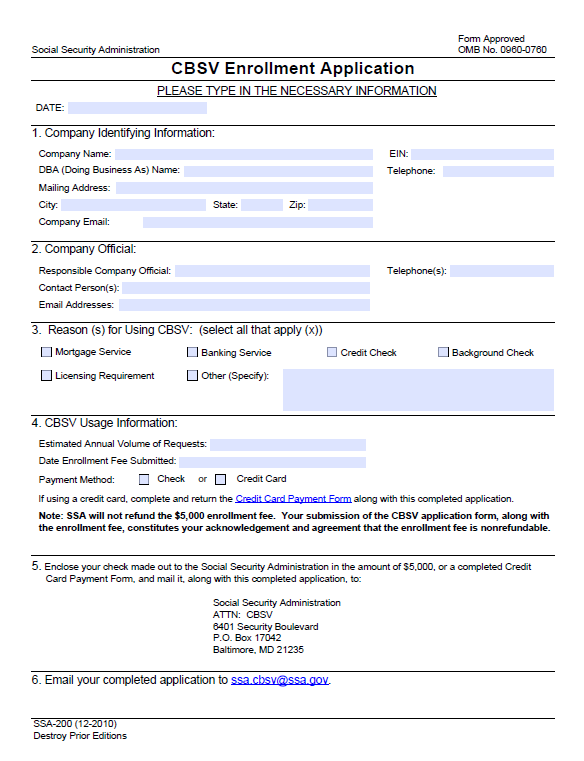 Initial Enrollment Fee – a one-time, non-refundable payment to the Social Security Administration to enroll in CBSV. The initial enrollment fee must be paid by credit card or check. The initial enrollment fee is currently $5,000 but it can change at any time.