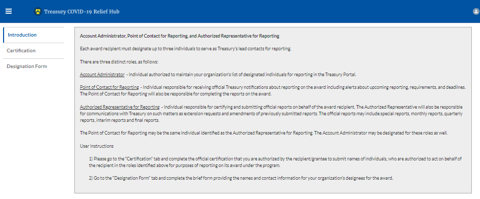HAF participants must designate staff or officials for the following three roles in managing reports for their HAF award. Participants must make the required designations before accessing Treasury’s Portal. The required roles are as follows: