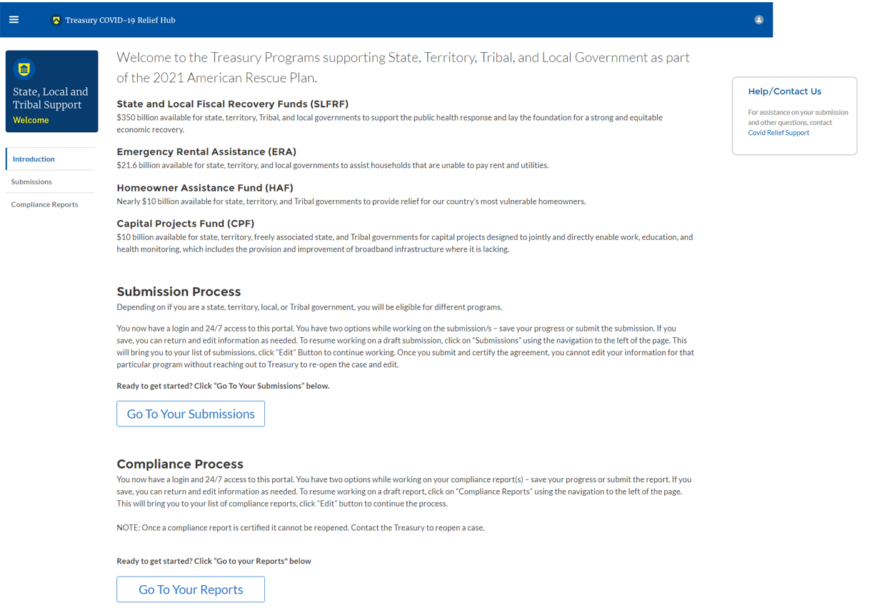 The link will take you to Treasury’s Portal State, Local, and Tribal Support landing page below. Once on that page, click on the Go to Your Reports button at the bottom left of the screen, as indicated by the red box below.