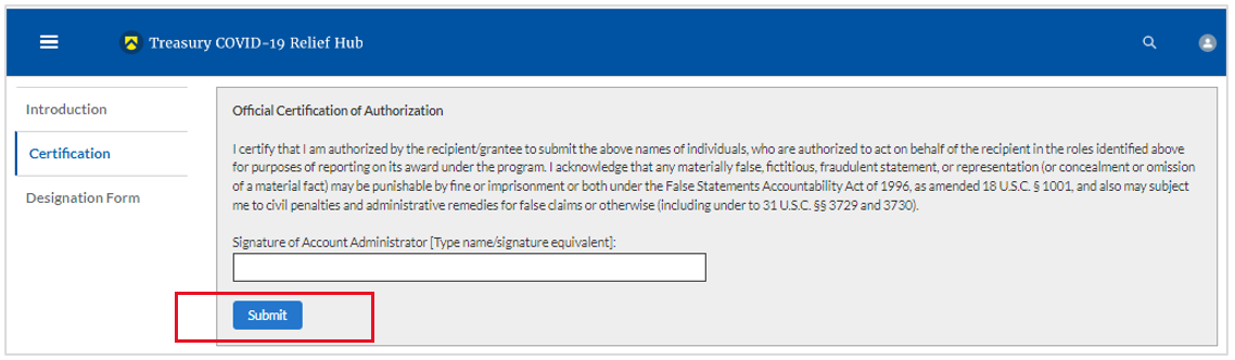 On the “Official Certification of Authorization” screen, enter your name to indicate you are authorized to submit the names of the designated individuals. Once you enter your name, click on the Submit button.
