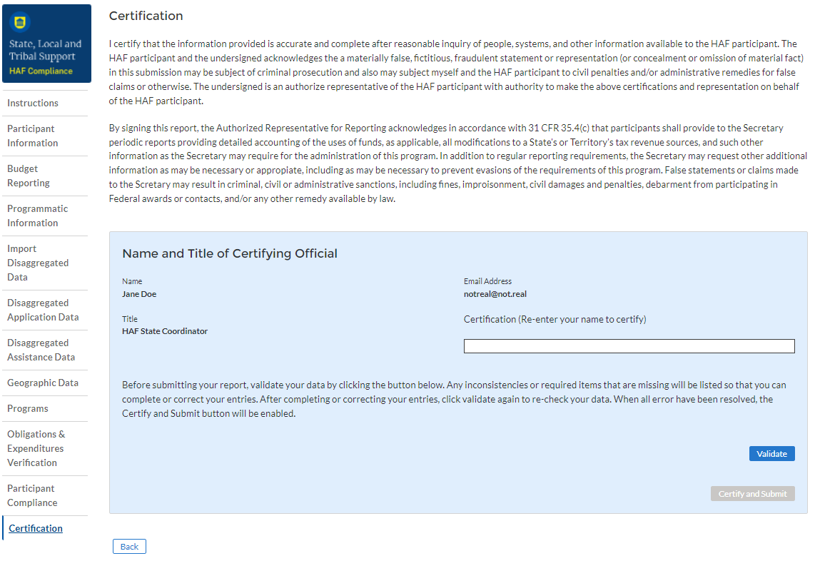 Authorized Representative for Reporting is responsible for certifying and submitting official reports on behalf of the HAF award recipient. Treasury will accept reports or other official communications only when submitted by the Authorized Representative for Reporting. The Authorized Representative for Reporting is also responsible for communications with Treasury on extension requests and amendments of previously submitted reports. The official reports may include special reports, monthly reports, quarterly reports, and final reports.