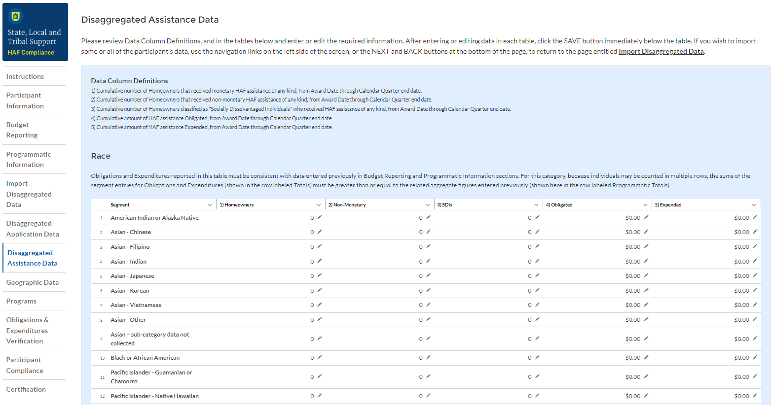 9 Tribal governments and the Department of Hawaiian Home Lands will not be required to complete the Disaggregated Data screen.
