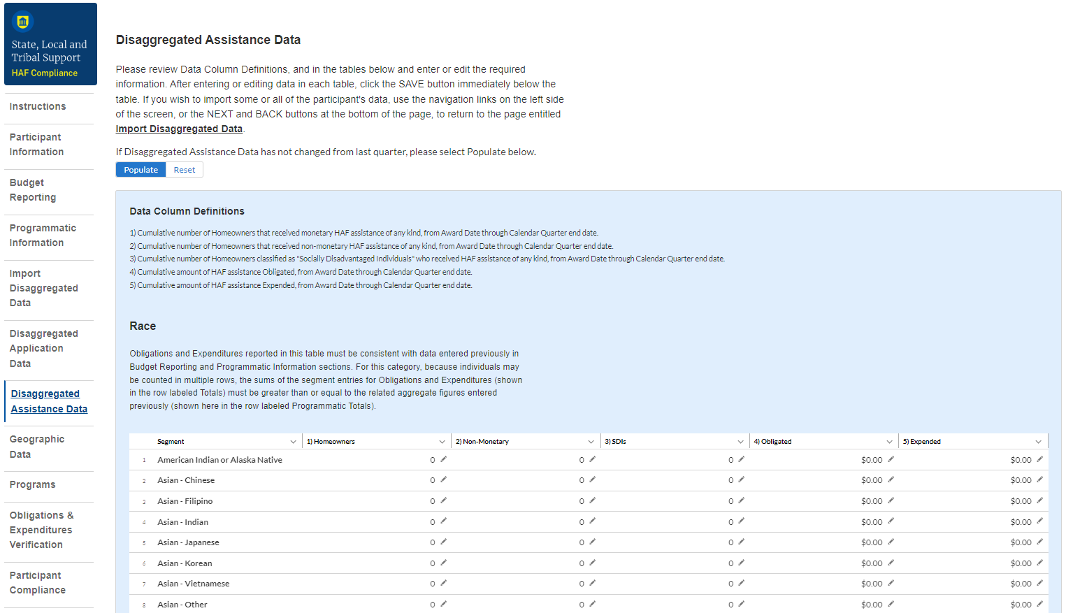 7 Tribal governments and the Department of Hawaiian Home Lands will not be required to complete the Disaggregated Data screen.