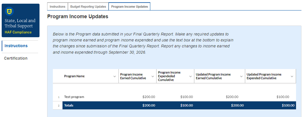 At the top of the screen, the calculated Total Balance Due to Treasury will be displayed based on the formula components presented in the Instructions screen, including any updates to cumulative obligations, updates to program income, and earned interest amounts reported (see Figure 54). If you have questions about the Total Balance Due to Treasury before certification, please send us an email at HAF@treasury.gov.