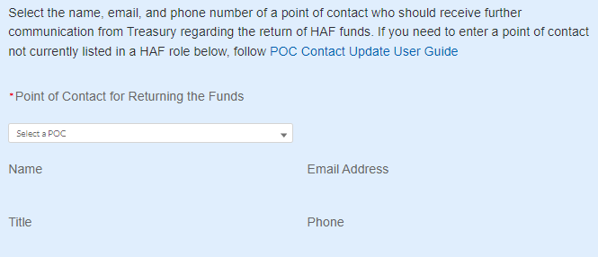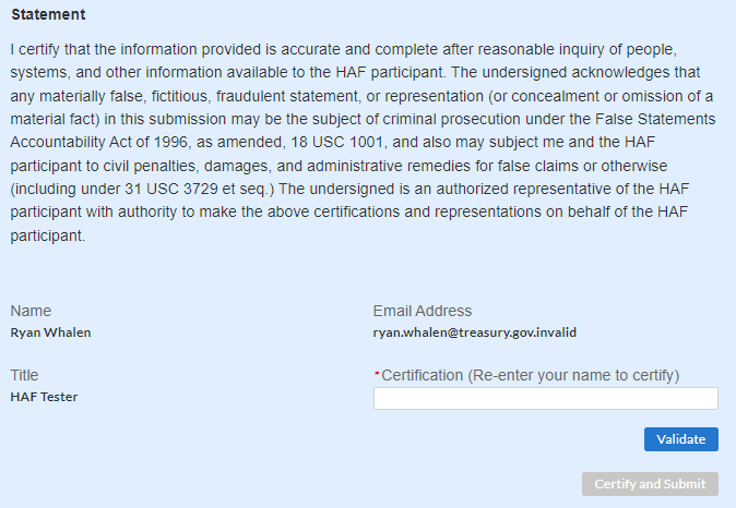 If you have additional questions about accessing or using Treasury’s Portal to provide the designees’ names and contact information, please email us at HAF@treasury.gov.