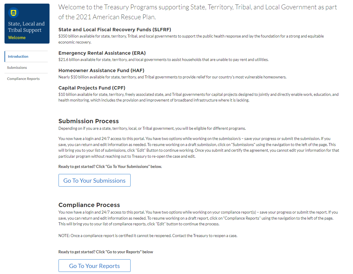 The link will take you to Treasury’s Portal State, Local, and Tribal Support landing page below. Once on that page, click on the Go to Your Reports button at the bottom left of the screen, as indicated by the red box below.