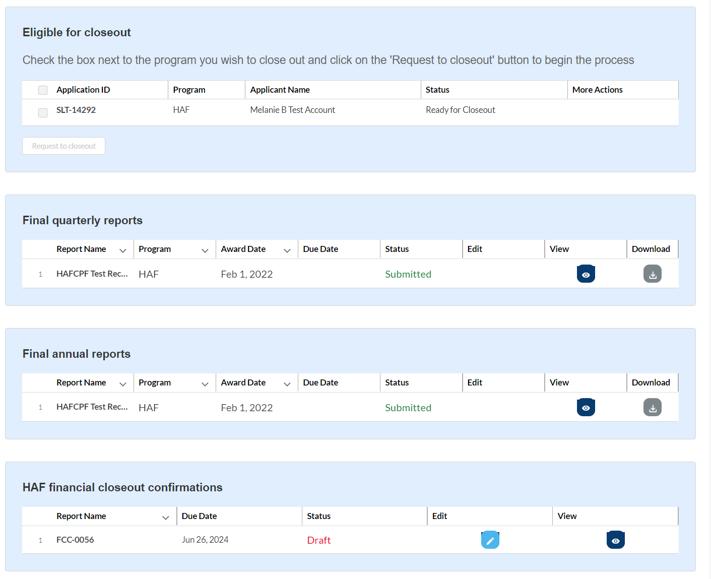 Additionally, you should visit Treasury’s HAF home page for the latest guidance and updates on Programmatic and reporting topics. The home page now includes a HAF Program Closeout Resource that provides more details on the Final Reports and the HAF closeout process.