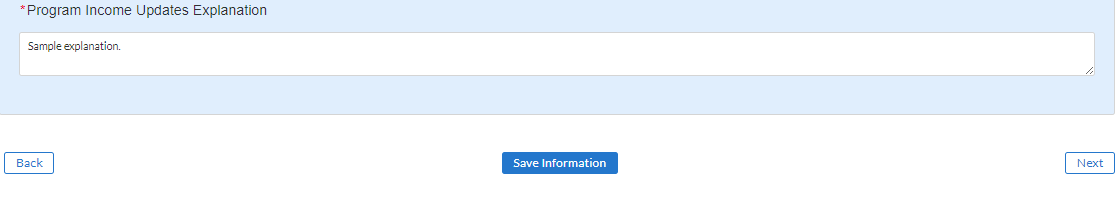 Click on “Save Information” at the bottom of the screen to save your Updated Program Income Earned Cumulative amounts and explanation. Item (d) Total Program Income Earned on the Instructions screen will update with your Updated Program Income Earned Cumulative amount(s) reported in the Program Income Updates section.