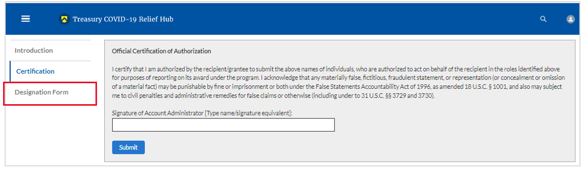 On the “Official Certification of Authorization” screen, enter your name to indicate you are authorized to submit the names of the designated individuals. Once you enter your name, click on the Submit button.