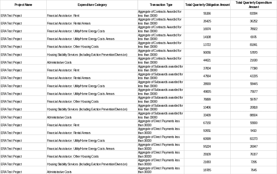 For subawards, contracts and direct payments to direct payees (including to beneficiaries) valued at less than $30,000, report the aggregate amount of all obligations and aggregated amount of all expenditures. This reporting must be performed up to 24 times (reported by 8 Expenditure Category types across 3 Aggregate Types). This will be reported on the Expenditures Tab under the Total of all Obligations and Total of all Expenditures Associated with the ERA2 Recipient’s Subawards, Contracts, and Direct Payments Valued at Less than $30,000 section.