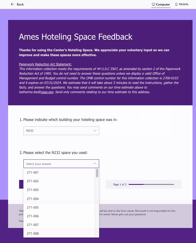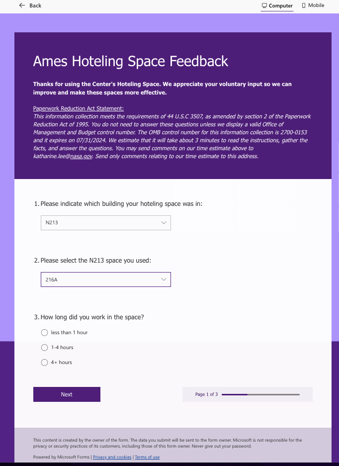 NASA Ames Hoteling Space Feedback - Screenshots