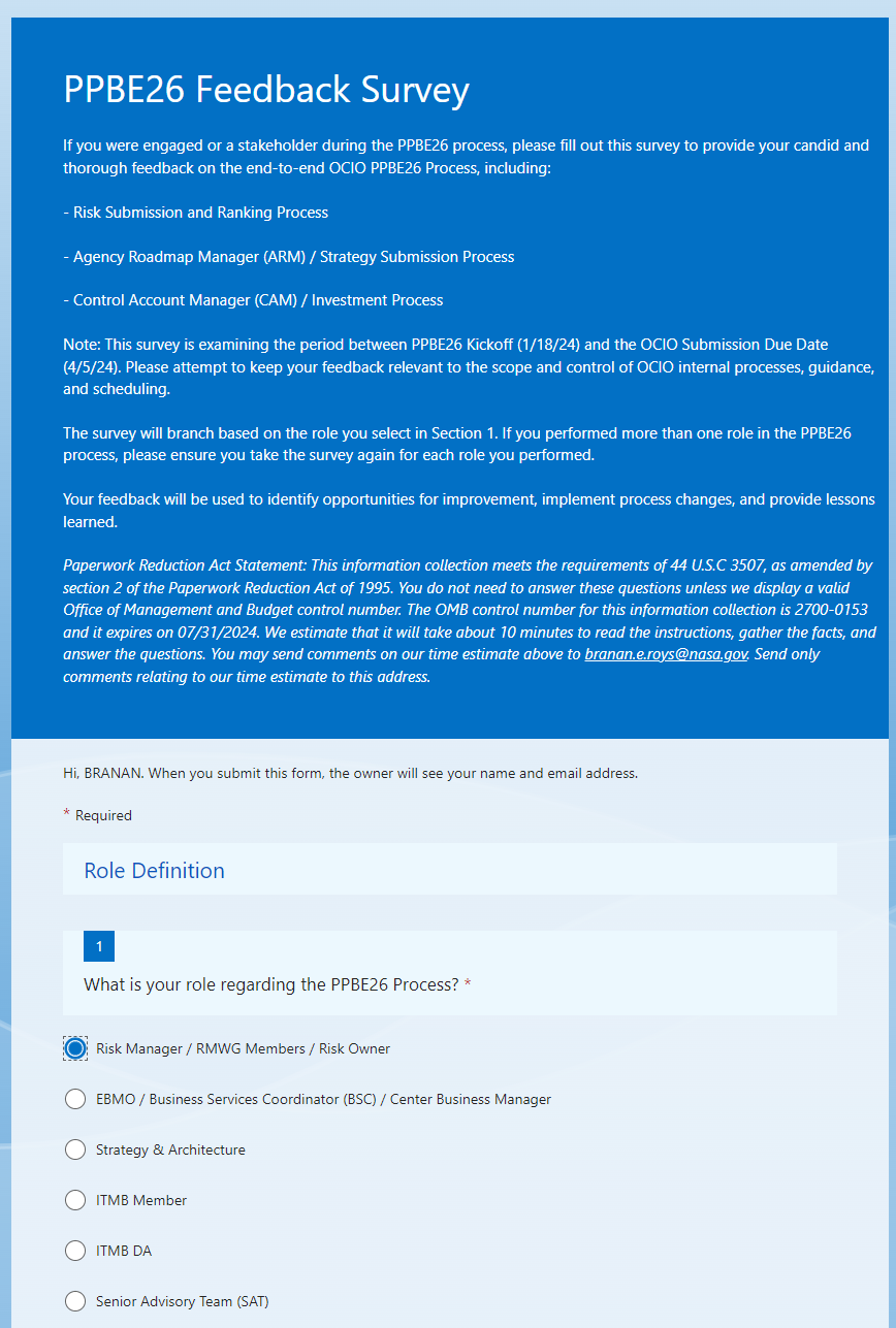 Paperwork Reduction Act Statement: This information collection meets the requirements of 44 U.S.C 3507, as amended by section 2 of the Paperwork Reduction Act of 1995. You do not need to answer these questions unless we display a valid Office of Management and Budget control number. The OMB control number for this information collection is 2700-0153 and it expires on 07/31/2024. We estimate that it will take about 10 minutes to read the instructions, gather the facts, and answer the questions. You may send comments on our time estimate above to branan.e.roys@nasa.gov. Send only comments relating to our time estimate to this address.