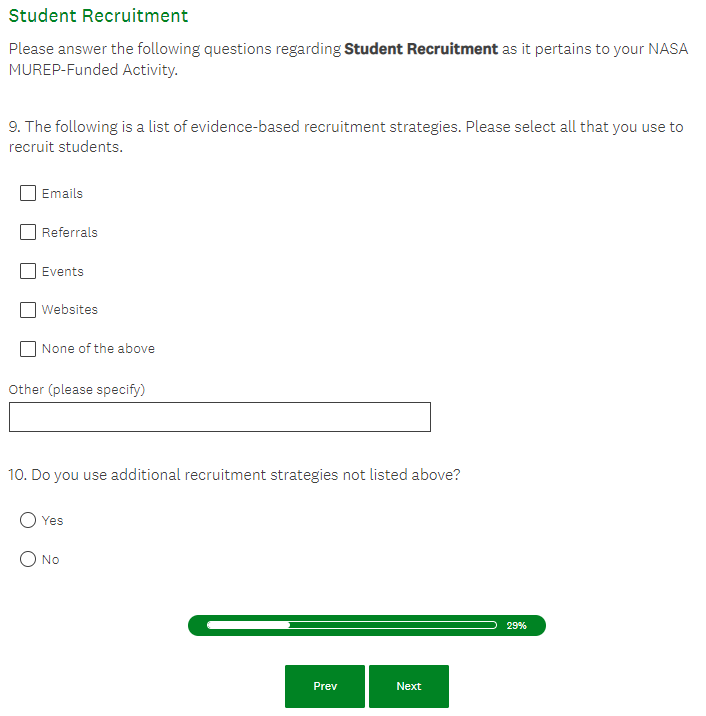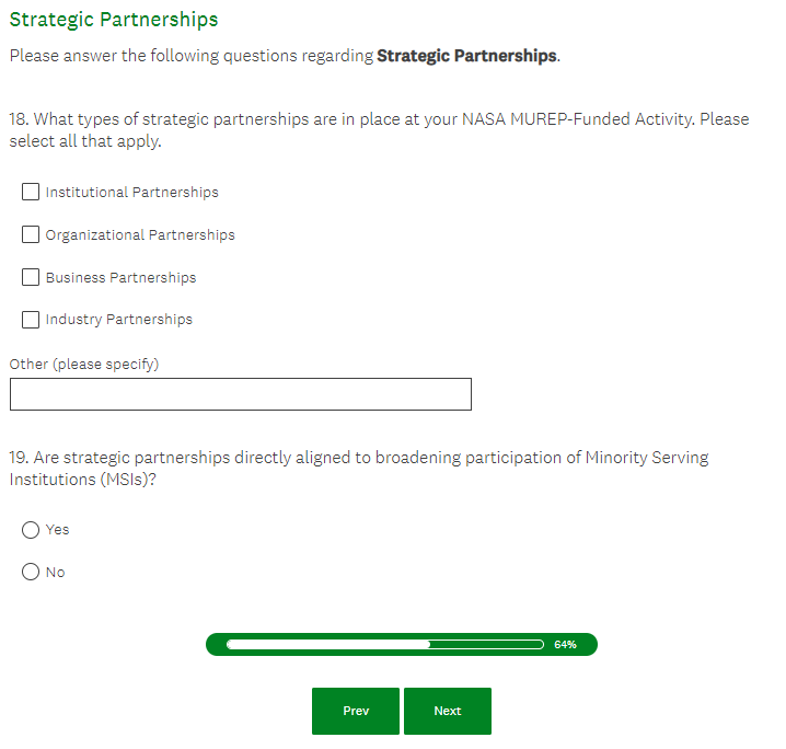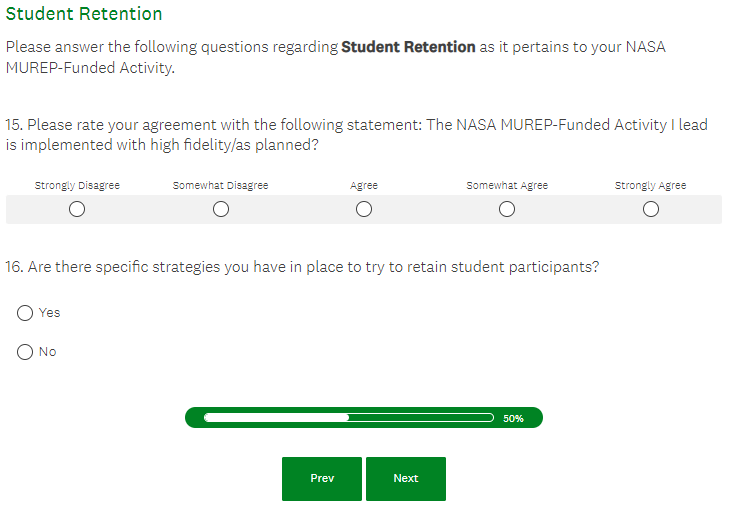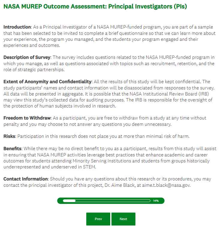 NASA MUREP Outcome Assessment (Pilot) - PI Survey Screenshots
