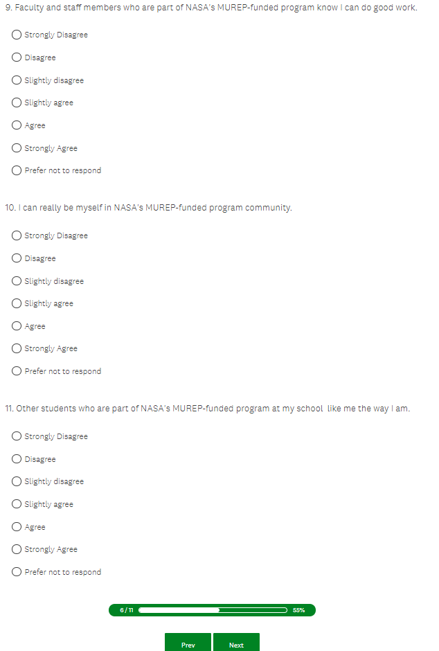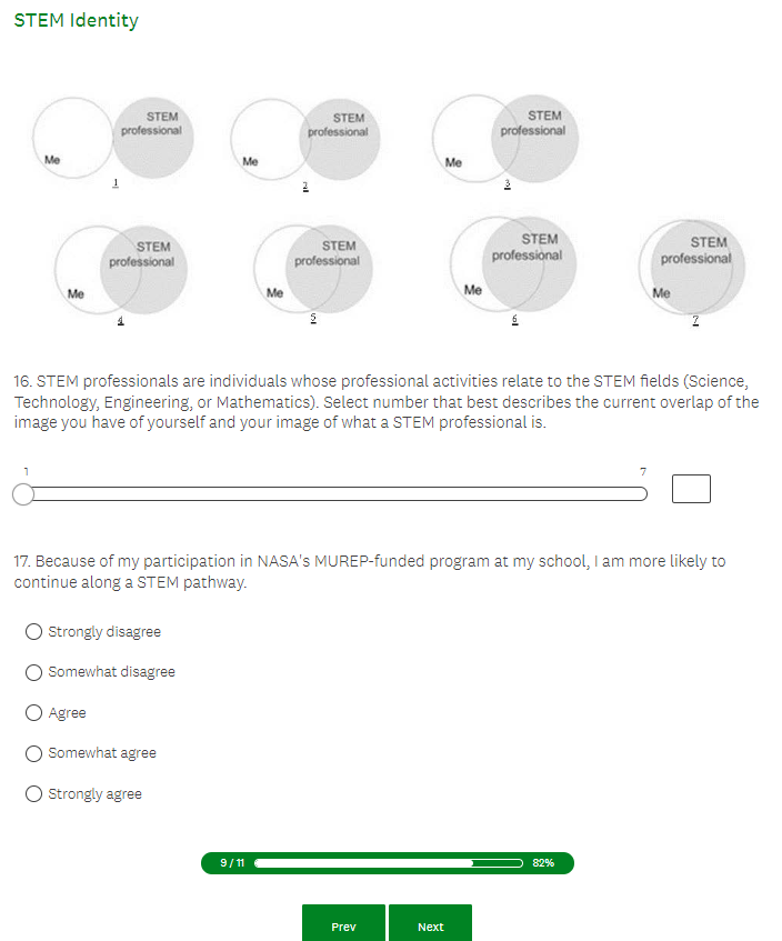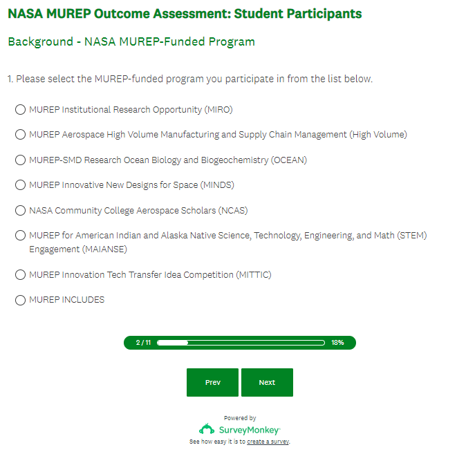 NASA MUREP Outcome Assessment (Pilot) - Student Survey Screenshots