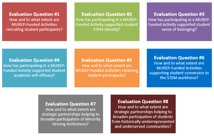 RESEARCH DESIGN OVERVIEW: NASA’s work in STEM Engagement is focused on serving students. MUREP provides support via competitive opportunities and awards to MSIs. MUREP investments enhance the research, academic, and technology capabilities of MSIs through multiyear cooperative agreements, bolstering their capacity in educating and preparing students for STEM careers. MUREP will continue to expand competitive opportunities to address specific gaps needs while building capacity at institutions. The focus of this study is to pilot two instruments (principal investigator survey and student survey) to collect stakeholders’ perceptions that can support NASA’s continued improvement of the MUREP portfolio, and measure student outcomes of participation in NASA MUREP-funded programs, activities, and/or resources. Recruitment, STEM Identity, Sense of Belonging, Retention and Self-Efficacy are measures of interest. This study is program evaluation and will be guided by eight evaluation questions for the approach and design of this study. Evaluation questions are presented in Figure 1 below.