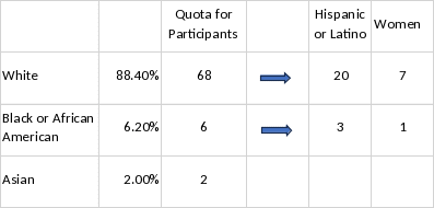 Figure 2 shows the quotas for Study 1 and Study 2. From this figure it can be seen that for Study 1, researchers will try to recruit 68 participants who are White; 6 that are Black or African American, and 2 that are Asian. Furthermore, among the 68 White participants, 20 should be Hispanic or Latino, and 7 should be women. Similarly, of the 6 Black or African American participants, 3 should be Hispanic or Latino and 1 should be a Woman. Similarly, for Study 2, the goal of researchers is to recruit 85 participants who are White, 7 participants who are Black or African American, and 4 participants who are Asian. Furthermore, among the 85 White participants, 24 should be Hispanic or Latino, and 9 should be Women; on the same token, among the 7 Black or African American participants, 5 should be Hispanic or Latino, and 1 should be a Woman.