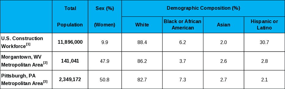 According to the Bureau of Labor Statistics, as shown in Table 1, the demographic composition of the construction workforce in the United States in 2018 was 9.9% Women, 88.4% White, 6.2% Black or African American, 2.0% Asian, and 30.7% Hispanic or Latino. According to the CensusReporter website, the metropolitan area of Morgantown, WV is shown in Figure 1a, and has a total population of 141,041 inhabitants, of which 47.9% are Women, 86.2% are White, 3.7% are Black or African American, 2.6% are Asian, and 2.8% are Hispanic or Latino. To increase the pool of potential participants, project researchers will expand the recruitment area to the Pittsburgh metropolitan area, which includes Pittsburgh, New Castle, Weirton PA-OH-WV combined statistical areas. The Pittsburgh metropolitan area, as shown in Table1, and Figure 1b, has a demographic composition of 50.8% Women, 82.7% White, 7.3% Black or African American, 2.7% Asian, and 2.1% Hispanic or Latino.