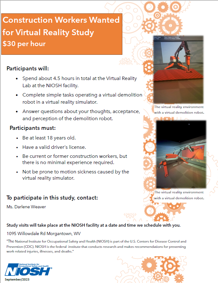 If you are eligible and decide to participate in the study, you will visit the Virtual Reality Laboratory located at NIOSH’s facilities in Morgantown, WV. The entire duration of your visit will be about 4.5 hours. You will receive compensation at a rate of $30 per hour for your time during the study. Compensation for partial hours is $10 per each 20 minutes, with periods less than 20 minutes rounded up.