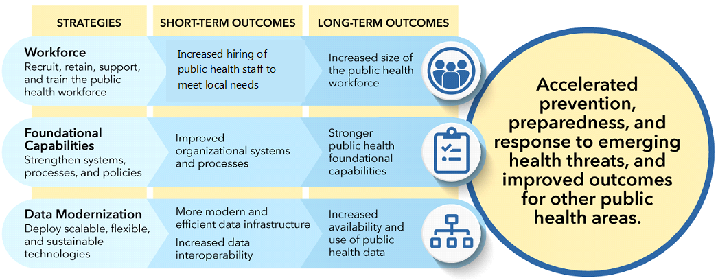 On November 29, 2022, the Centers for Disease Control and Prevention (CDC) awarded $3.2 billion to help state, local, and territorial and freely associated public health agencies across the U.S. strengthen their public health workforce and infrastructure through the Public Health Infrastructure Grant (PHIG). This grant provides 107 jurisdictions (Component A recipients) with disease-agnostic funding to support public health infrastructure needs. The three grant strategies are Strategy A1: Workforce; Strategy A2: Foundational Capabilities; and Strategy A3: Data Modernization. The priority short-term outcomes recipients are expected to achieve by the end of the five (5)-year period of performance include: (1) Increased hiring of public health staff to meet local needs and (2) Improved organizational systems and processes, among other outcomes. In the long term, expected outcomes include: (1) Increased size and capabilities of the public health workforce; (2) Stronger public health foundational capabilities; (3) Increased availability and use of public health data; and (4) Improved sharing of lessons learned.