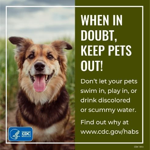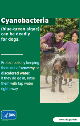 Social media message: If your pet gets into scummy or discolored water, rinse them off with tap water right away and don’t let them lick their fur. The water could have harmful algae or cyanobacteria, which can be deadly for pets. More info: https://www.cdc.gov/habs/specific-groups/animal-owners-cyanobacteria.html