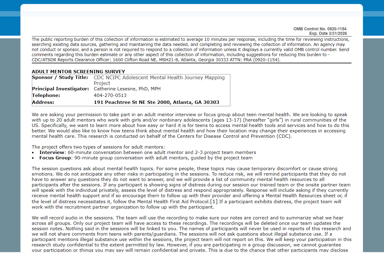 We are asking your permission to take part in an adult mentor interview or focus group about teen mental health. We are looking to speak with mentors who work with girls and/or nonbinary adolescents (ages 13-17) (hereafter “girls”) in rural communities of the US. Specifically, we want to learn more about how easy or hard it is for teens to access mental health tools and services and how to do this better. We would also like to know how teens think about mental health and how their location may change their experiences in accessing mental health care. This research is conducted on behalf of the Centers for Disease Control and Prevention (CDC).