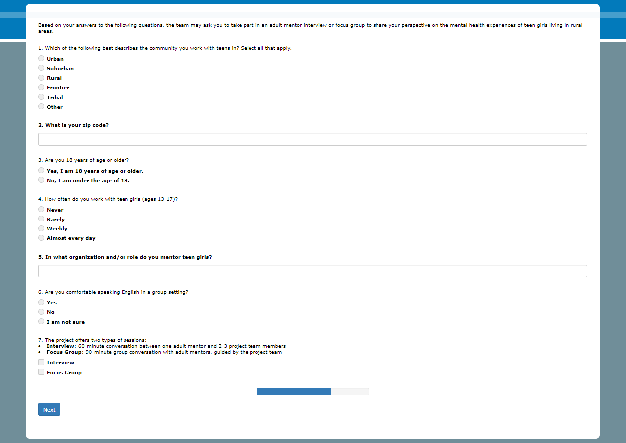 Based on your answers to the following questions, the team may ask you to take part in an adult mentor interview or focus group to share your perspective on the mental health experiences of teen girls living in rural areas.