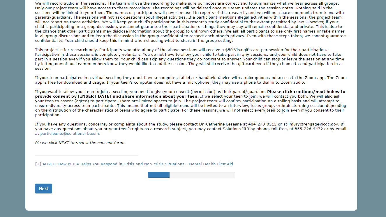 If you have any questions, concerns, or complaints about the study, please contact Dr. Catherine Lesesne at 404-270-0513 or at injuryctrengage@cdc.gov. If you have any questions about you or your teen’s rights as a research subject, you may contact Solutions IRB by phone, toll-free, at 855-226-4472 or by email at participants@solutionsirb.com.