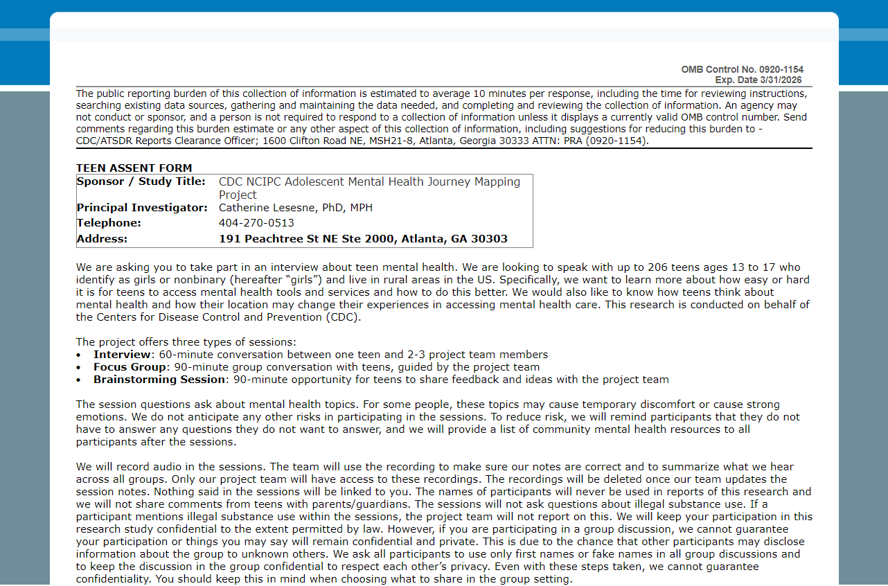 We are asking you to take part in an interview about teen mental health. We are looking to speak with up to 206 teens ages 13 to 17 who identify as girls or nonbinary (hereafter “girls”) and live in rural areas in the US. Specifically, we want to learn more about how easy or hard it is for teens to access mental health tools and services and how to do this better. We would also like to know how teens think about mental health and how their location may change their experiences in accessing mental health care. This research is conducted on behalf of the Centers for Disease Control and Prevention (CDC).