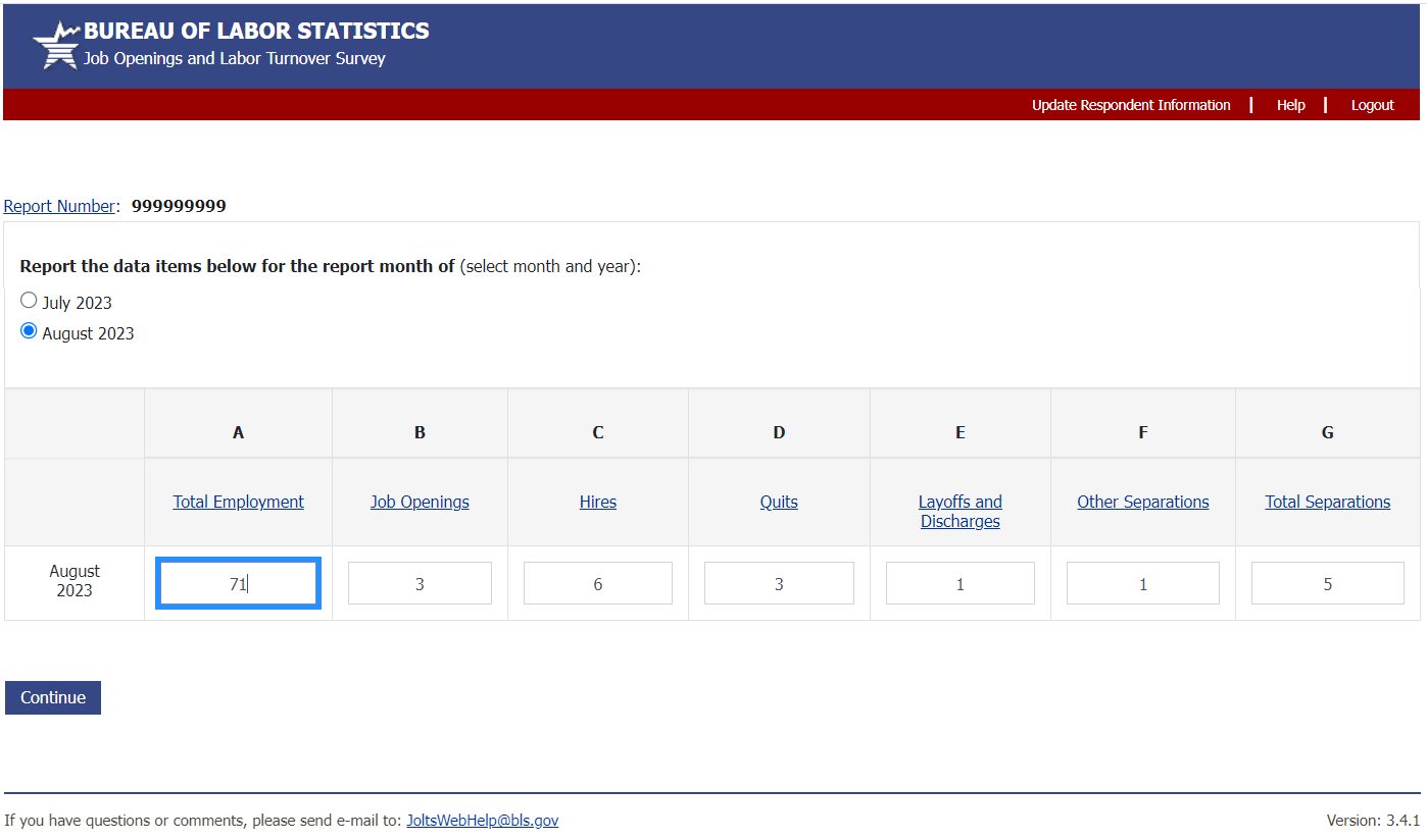 If you experience any difficulties, send an e-mail to JOLTSWebHelp@bls.gov. This e-mail link is at the bottom of every page.