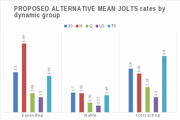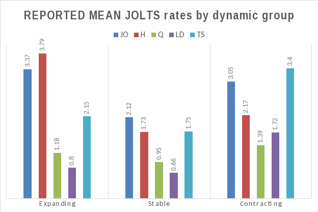 The reported JOLTS data confirms the theoretical relationship detailed previously. Stable establishments tend to have relatively low levels of job openings, hires and separations and, in aggregate, stable establishments tend to have reported hires rates approximately equal to the reported separations rates. Expanding establishments tend to have as a group reported hires rates significantly higher than reported separations rates, and contracting establishments as a group tend to report higher separations rates than hires rates.