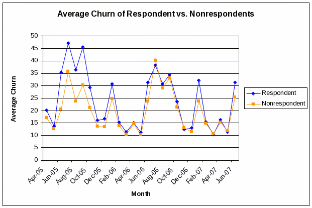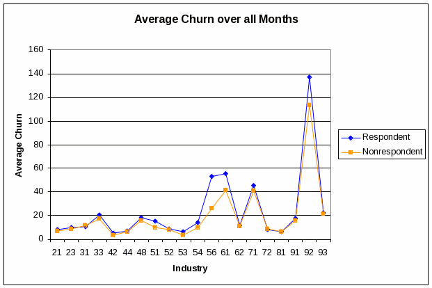 At the industry level, the differences in the estimates using the two imputation approaches generally take the form illustrated in the graph below. There is very little difference in the industry estimates for most months. However, when a significant upward increase in the estimate occurs (i.e., “spikes” in the data), the spike is often slightly smaller when using the new imputation methodology. The truncation of the model has the intended effect of lessening the frequency and magnitude of estimate “spikes” generated solely by imputation.