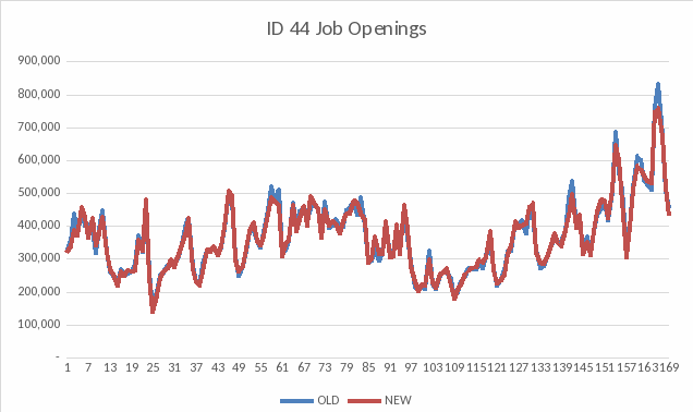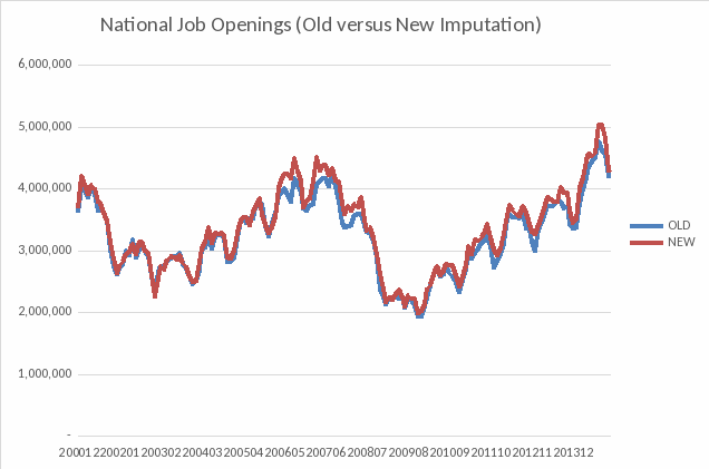 The overall effect on JOLTS estimation is modest, primarily owing to the fact that imputation accounts for only 12% of the microdata. Below is the national estimate of Job Openings holding all methodology constant except imputation.