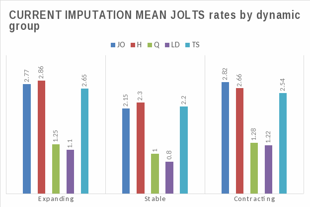 The imputation algorithm described in this paper has been successfully programmed and a complete set of imputed values has been generated on the historical JOLTS series. We can now compare the mean rates of JOLTS respondents, the mean rates generated by the current nearest neighbor algorithm, and the mean rates generated by the proposed alternative. This comparison will be made with respect to employment dynamics.