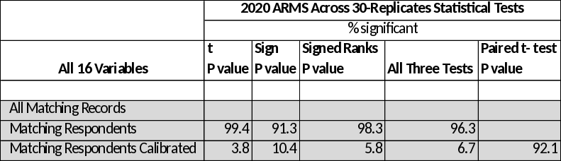 Paired t tests suggest the null hypotheses of “No Mean Bias Reductions” are rejected for fifteen of the sixteen study variables. The current rate of significant Mean Bias Reductions of 93.8 is well above the 29.4 and 76.5 percent found in 2005 and 2006, respectively. A possible explanation for the improvements in paired t test may be that a richer set of calibration targets were used in 2020 relative to the previous studies. Over time, NASS has evolved the targeted data set from about twelve targets in 2002, to about thirty targets in 2020. The 2005 and 2006 studies used twelve targets.