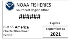 The captain is required to have the permit on the fishing vessel. Visually inspect the permit to get the federal charter permit number. Also, if the captain has a federal charter permit number the vessel is required to have a decal on the port side of the boat. Below is an example of what the decal will look like although they make the decal in a different color each year. The decal will not have the charter permit number, but instead the decal displays the registration of the vessel.