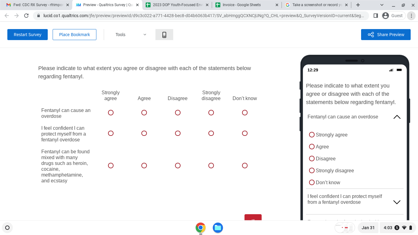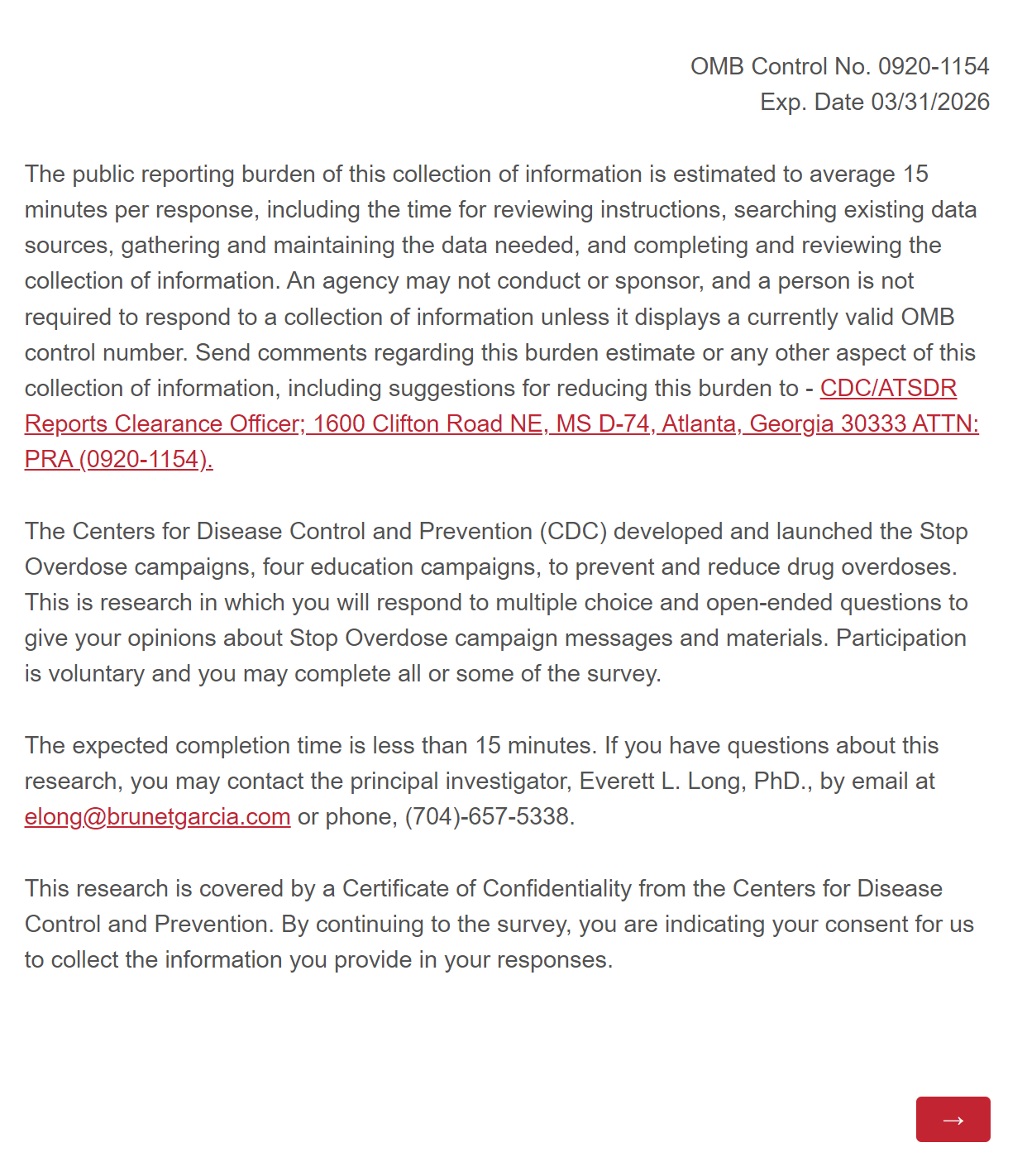 The Centers for Disease Control and Prevention (CDC) developed and launched the Stop Overdose campaigns, four education campaigns, to prevent and reduce drug overdoses. This is research in which you will respond to multiple choice and open-ended questions to give your opinions about Stop Overdose campaign messages and materials. Participation is voluntary and you may complete all or some of the survey. If you have questions about this research, you may contact the principal investigator, Everett L. Long, PhD., by email at elong@brunetgarcia.com or phone, (704)-657-5338.