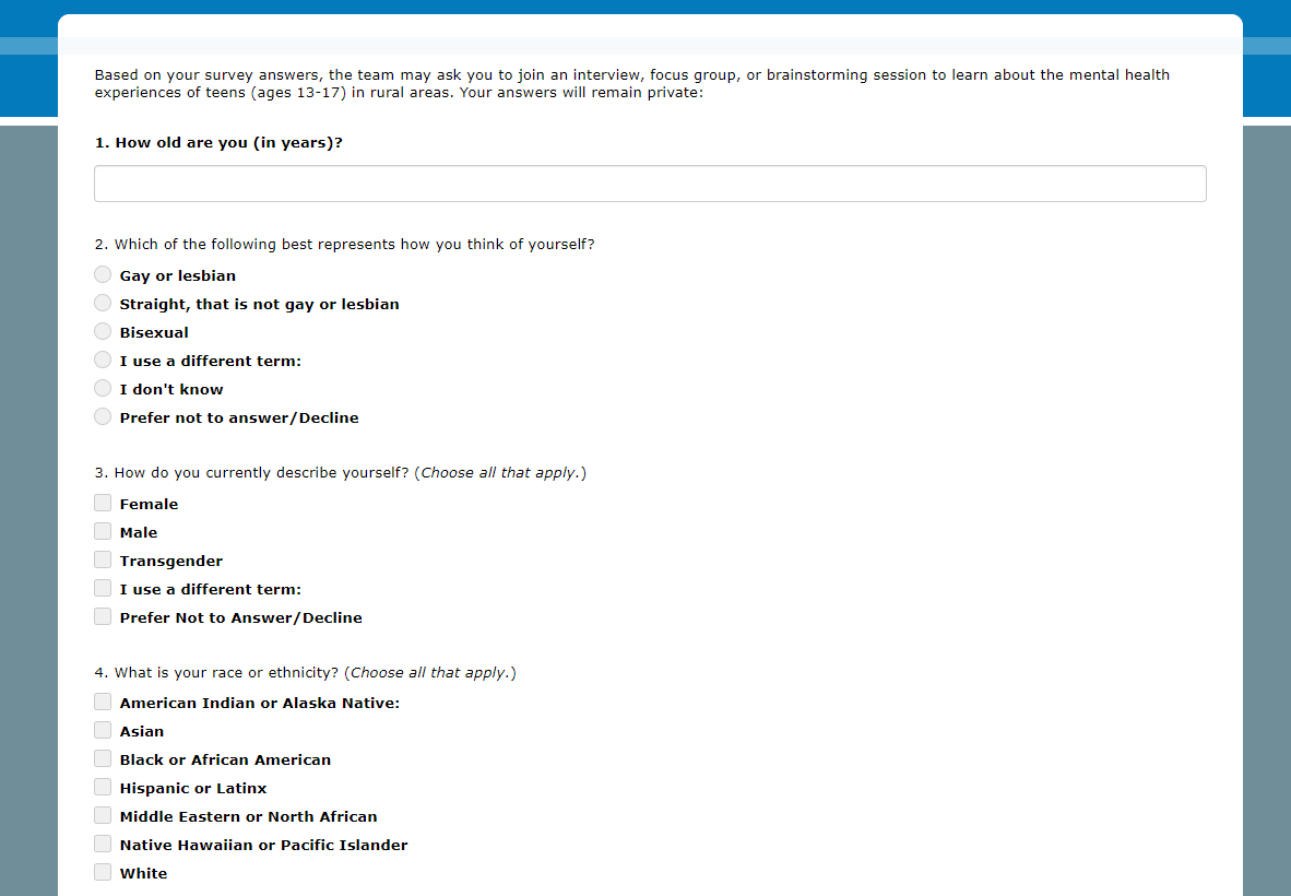 Based on your survey answers, the team may ask you to join an interview, focus group, or brainstorming session to learn about the mental health experiences of teens (ages 13-17) in rural areas.