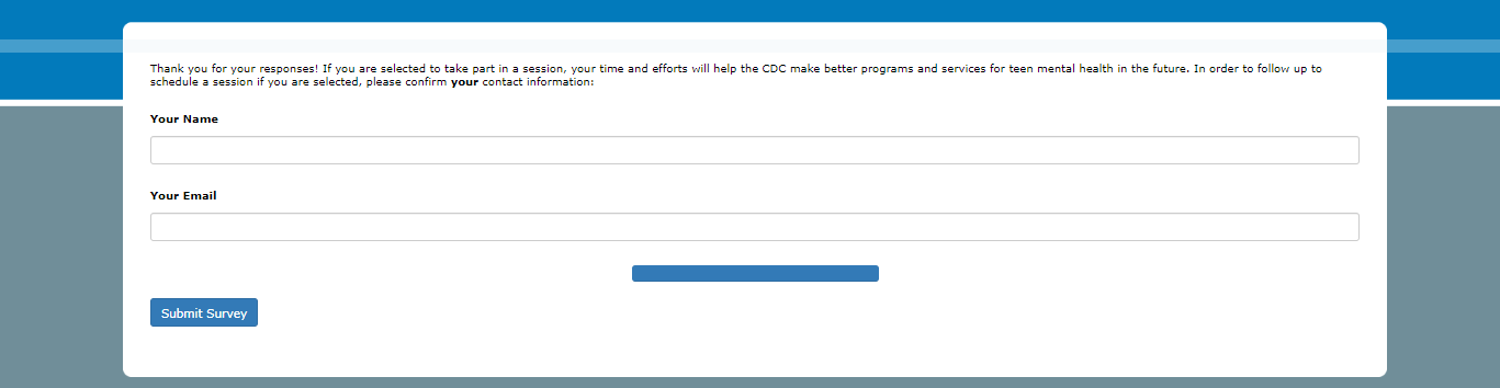 Thank you for your responses! If you are selected to take part in a session, your time and efforts will help the CDC make better programs and services for teen mental health in the future. In order to follow up to schedule a session if you are selected, please confirm your contact information: