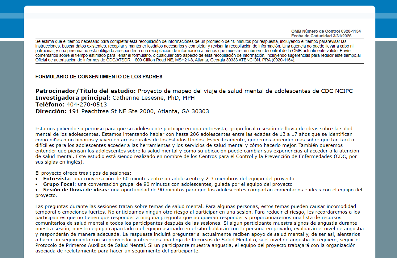 Estamos pidiendo su permiso para que su adolescente participe en una entrevista, grupo focal o sesión de lluvia de ideas sobre la salud mental de los adolescentes. Estamos intentando hablar con hasta 206 adolescentes entre las edades de 13 a 17 años que se identifican como niñas o no binarios y viven en áreas rurales de los Estados Unidos. Específicamente, queremos aprender más sobre qué tan fácil o difícil es para los adolescentes acceder a las herramientas y los servicios de salud mental y cómo hacerlo mejor. También queremos entender qué piensan los adolescentes sobre la salud mental y cómo su ubicación puede cambiar sus experiencias al acceder a la atención de salud mental. Este estudio está siendo realizado en nombre de los Centros para el Control y la Prevención de Enfermedades (CDC, por sus siglas en inglés).