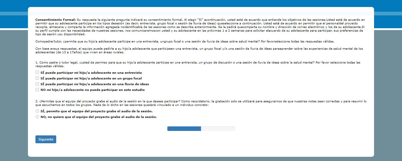 Si desea que su hijo/a adolescente se una a una sesión, debe dar su consentimiento (permiso) como su padre/tutor legal. Por favor haga clic en continuar/siguiente a continuación para dar su consentimiento antes del [INSERTAR FECHA] y compartir información sobre su adolescente. Si seleccionamos a su adolescente para participar, nos comunicaremos con ambos. También le pediremos a su adolescente que dé su consentimiento (esté de acuerdo) para participar. Hay espacios limitados. El equipo del proyecto confirmará la participación de forma continua e intentará garantizar la diversidad entre los adolescentes participantes. Esto significa que no todos los adolescentes elegibles serán invitados a una entrevista, grupo focal o sesión de lluvia de ideas dependiendo de la distribución de las características de los adolescentes que acepten participar. Por estos motivos, no seleccionaremos a todos los adolescentes para que participen, incluso si usted da su consentimiento para su participación.