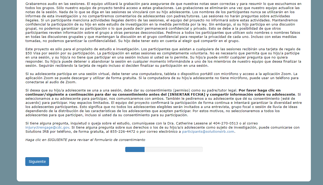 Si tiene alguna pregunta, inquietud o queja sobre el estudio, comuníquese con la Dra. Catherine Lesesne al 404-270-0513 o al correo injuryctrengage@cdc.gov. Si tiene alguna pregunta sobre sus derechos o los de su hijo/a/s adolescente como sujeto de investigación, puede comunicarse con Solutions IRB por teléfono, de forma gratuita, al 855-226-4472 o por correo electrónico a participants@solutionsirb.com.