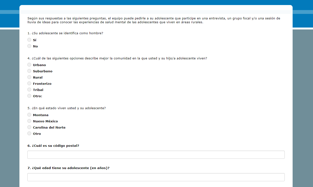 Según sus respuestas a las siguientes preguntas, el equipo puede pedirle a su adolescente que participe en una entrevista, un grupo focal y/o una sesión de lluvia de ideas para conocer las experiencias de salud mental de las adolescentes que viven en áreas rurales.