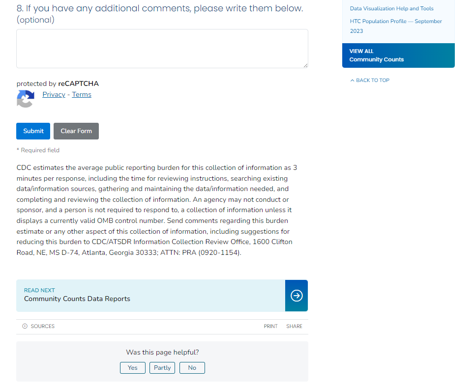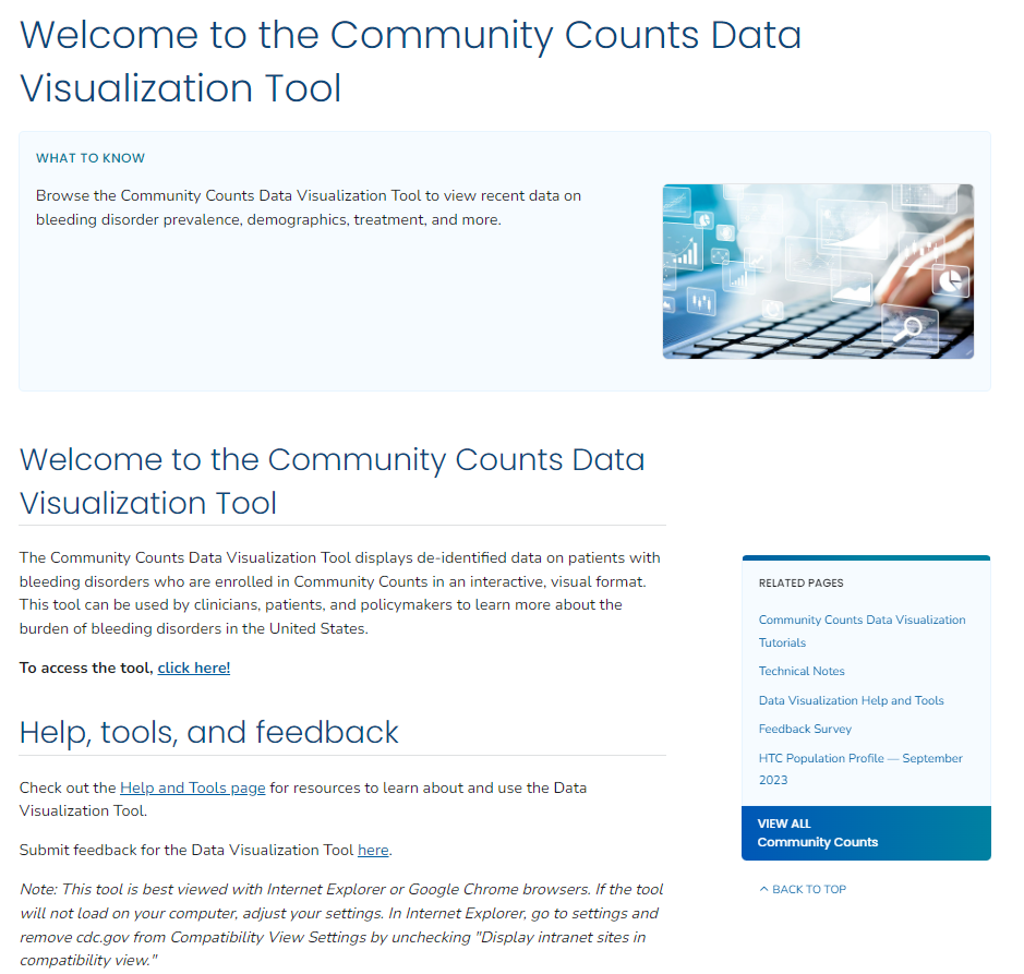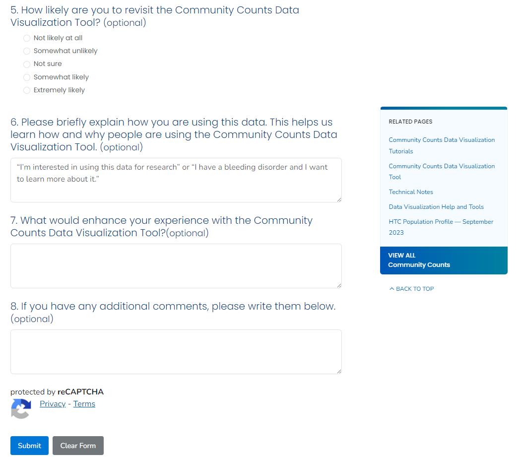 View the webpage for the feedback survey here: https://www.cdc.gov/hemophilia-community-counts/php/training/community-counts-data-visualization-tool-feedback-survey.html