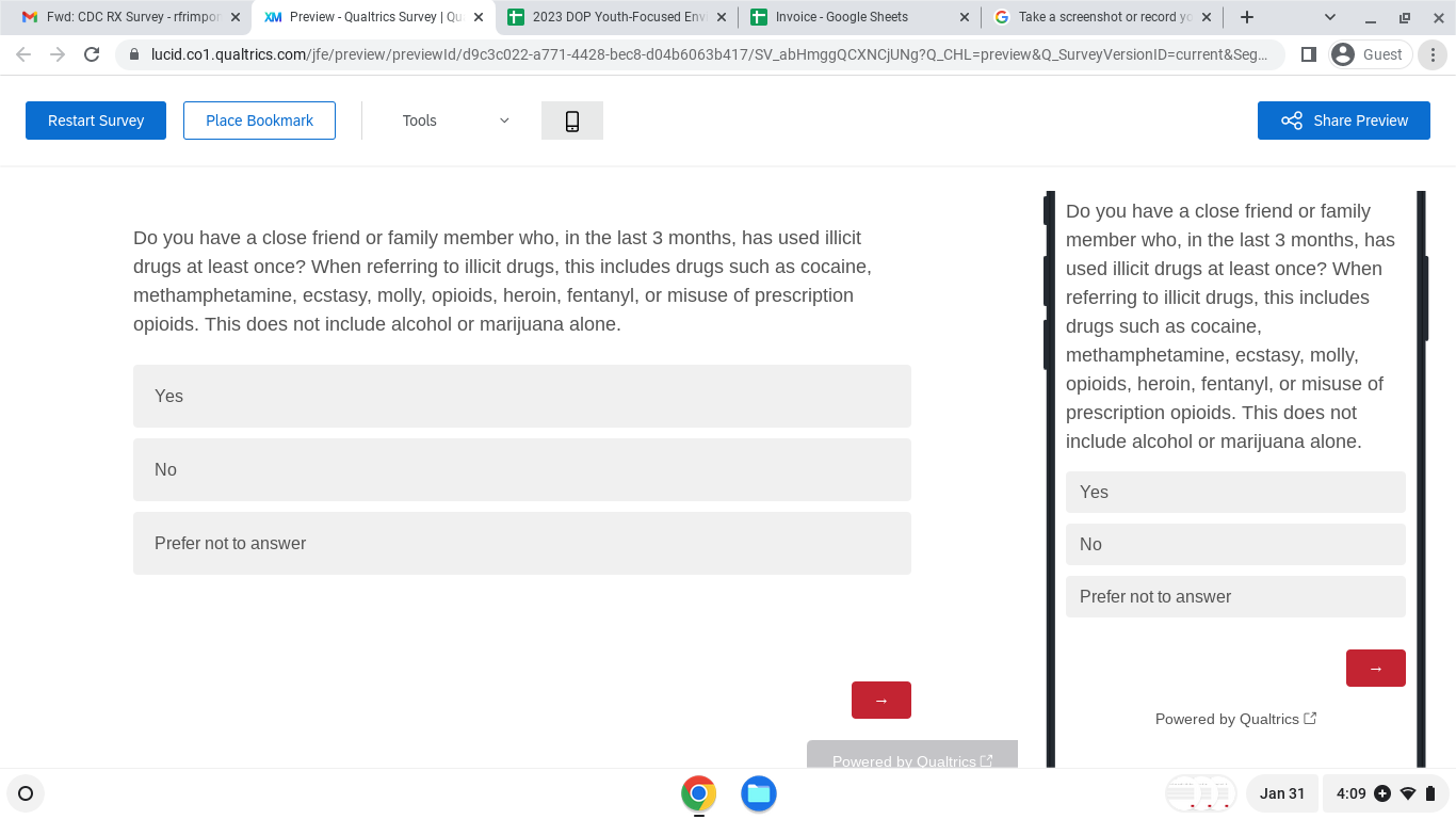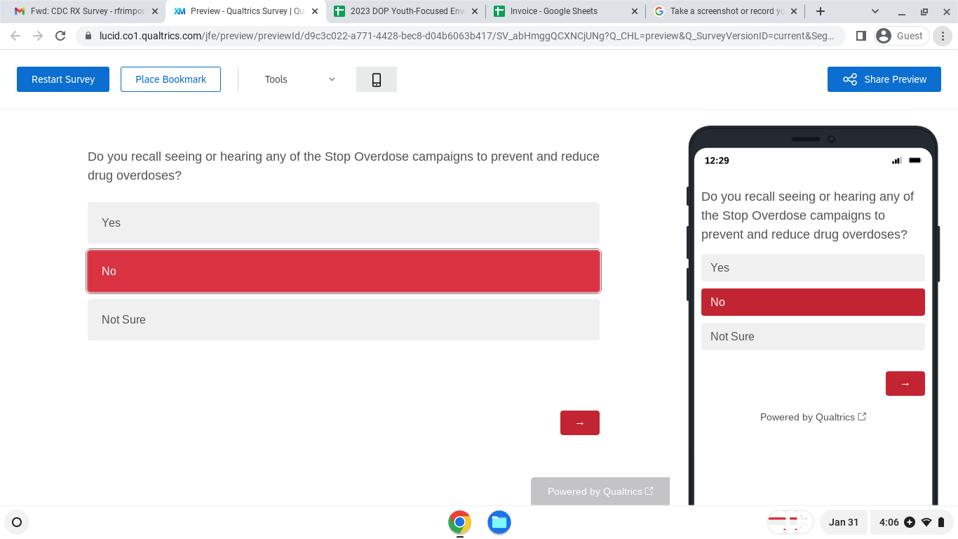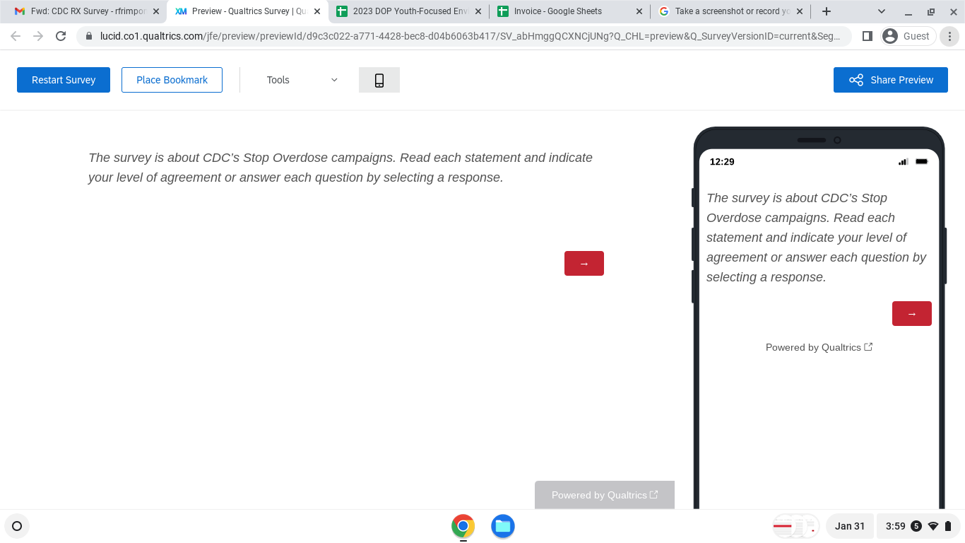 The Centers for Disease Control and Prevention (CDC) developed and launched the Stop Overdose campaigns, four education campaigns, to prevent and reduce drug overdoses. This is research in which you will respond to multiple choice and open-ended questions to give your opinions about Stop Overdose campaign messages and materials. Participation is voluntary and you may complete all or some of the survey. If you have questions about this research, you may contact the principal investigator, Everett L. Long, PhD., by email at elong@brunetgarcia.com or phone, (704)-657-5338.